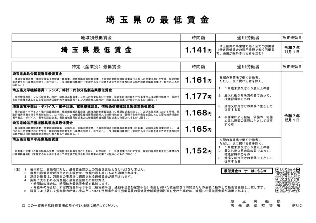 令和7年11月1日から、埼玉県最低賃金は時間額1,141円となります。この金額は、埼玉県内の事業場で働くすべての労働者に適用されます。