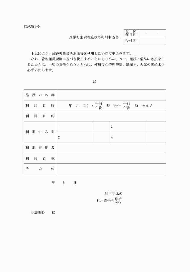 第4条 この施設を利用しようとする者は、様式第1号による「利用申込書」を、管理者に提出するものとする。