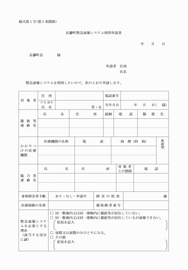 第5条 緊急通報システムを利用しようとする者は、緊急通報システム利用申請書(様式第1号。以下「申請書」という。)により町長に申請しなければならない。