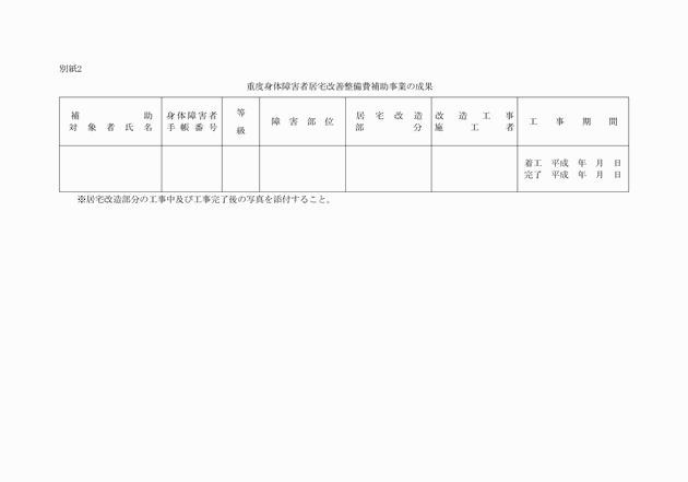 第2条 事業の対象者は、障害部位が下肢又は体幹機能障害の1級又は2級の身体障害者で生活保護法による被保護世帯又は前年分の所得税額が10万500円以下の世帯に属する者とし、対象経費は、当該障害者に対し、行う居宅改造に直接要する別表に掲げる対象経費とする。