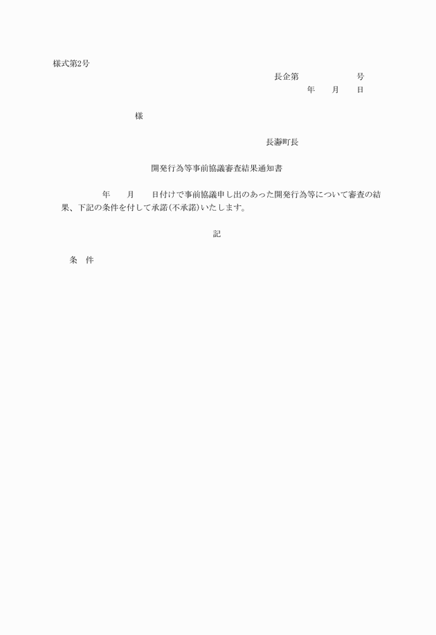 2 町長は、開発事前協議の審査の結果を事業主に対し、開発行為等事前協議審査結果通知書(様式第2号)により通知するものとする。