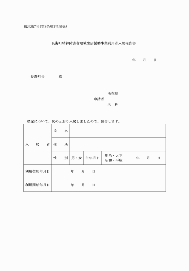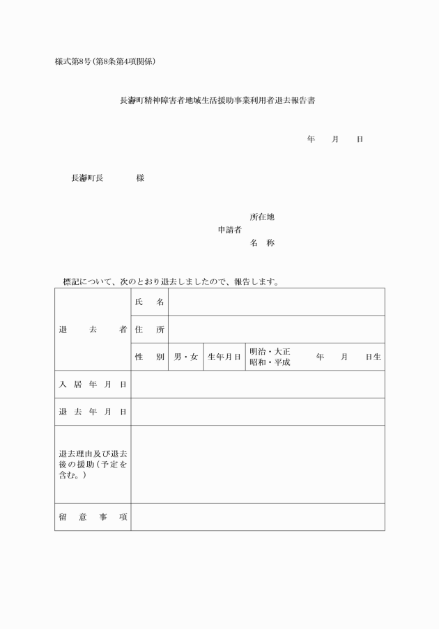 4 運営主体の長は、入居の終了に際し、速やかに町長に長瀞町精神障害者地域生活援助事業利用者退去報告書(様式第8号)を提出するものとする。