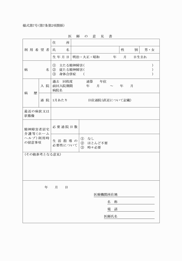 第7条 ホームヘルパーの派遣を希望する当該精神障害者又はその者が属する世帯の生計中心者(以下「利用者等」という。)は、長瀞町精神障害者居宅介護等事業利用申請書(様式第6号)を町長に提出するものとする。ただし、町長が必要と認める場合にあっては、提出は事後でも差し支えないものとする。
