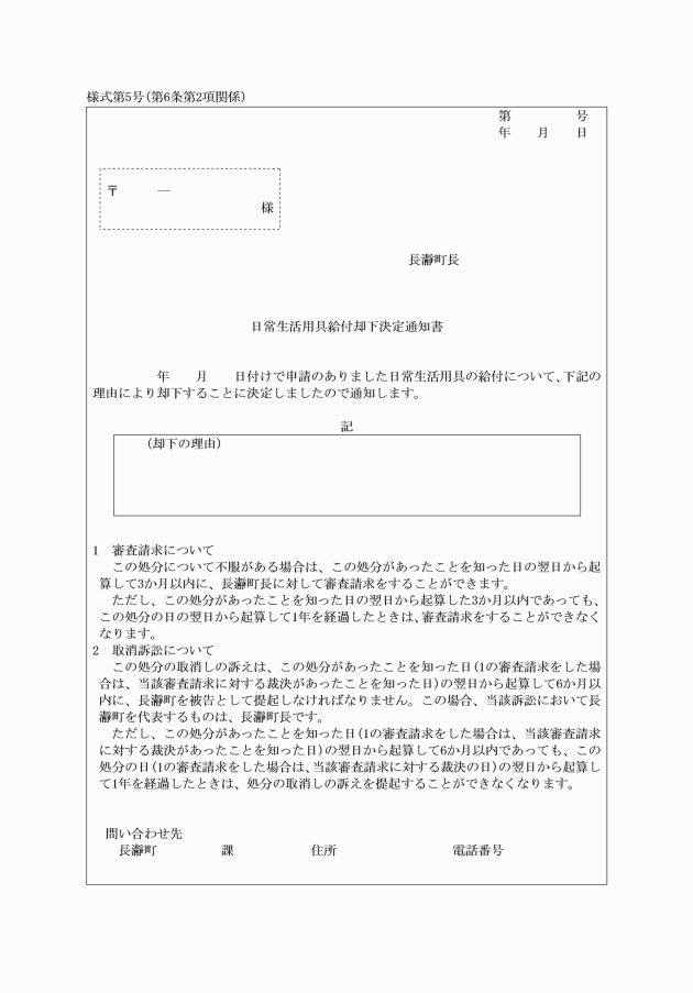 第5条 用具の給付を希望する障害者等又はこれを扶養する者は、日常生活用具給付申請書(様式第1号)により町長に申請するものとする。