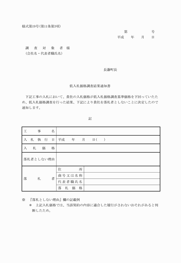 第11条 入札執行者は、低入札価格調査の結果、又は委員会の審査の結果、当該契約の内容に適合した履行がなされないおそれがないと判断したときは、当該調査対象者を落札者と決定し、落札者及びその他の入札者に対して、その旨を落札者決定通知書(様式第18号)により通知するものとする。