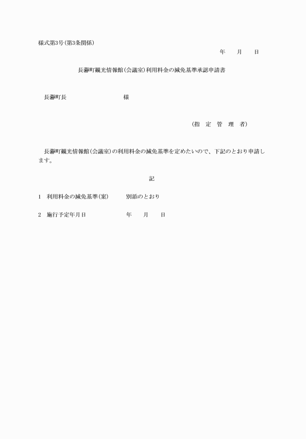 第3条 指定管理者は、利用料金の減免基準を定めようとする場合、長瀞町観光情報館(会議室)利用料金の減免基準承認申請書(様式第3号)を町長に提出しなければならない。