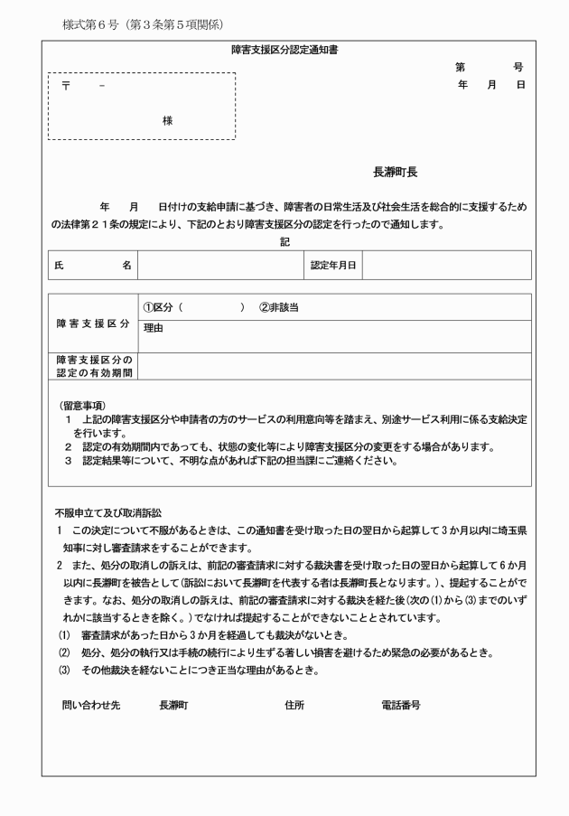 5 町長は、法第21条第1項に規定する障害支援区分の認定をしたときは、障害支援区分認定通知書(様式第6号)により支給決定障害者等に通知する。