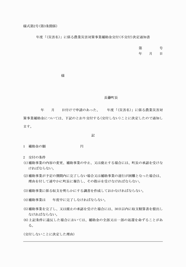 第2条 補助金の交付を受けようとする被害を受けた農業者(以下「被災農業者」という。)は、農業災害対策事業補助金交付申請書(様式第1号)により、次に掲げる書類を添付して、町長に提出しなければならない。