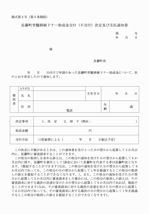 第4条 助成金の交付を受けようとする者(以下「申請者」という。)は、長瀞町骨髄移植ドナー助成金交付申請書兼請求書(様式第1号)に、次に掲げる書類を添えて、骨髄等の提供が完了した日から90日以内に町長に提出するものとする。ただし、やむを得ないと町長が認めた場合はこの限りではない。
