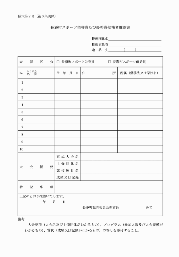 3 町外に拠点を置く団体の一員(補欠選手を含む。)として表彰基準に該当する者は、個人として推薦する。