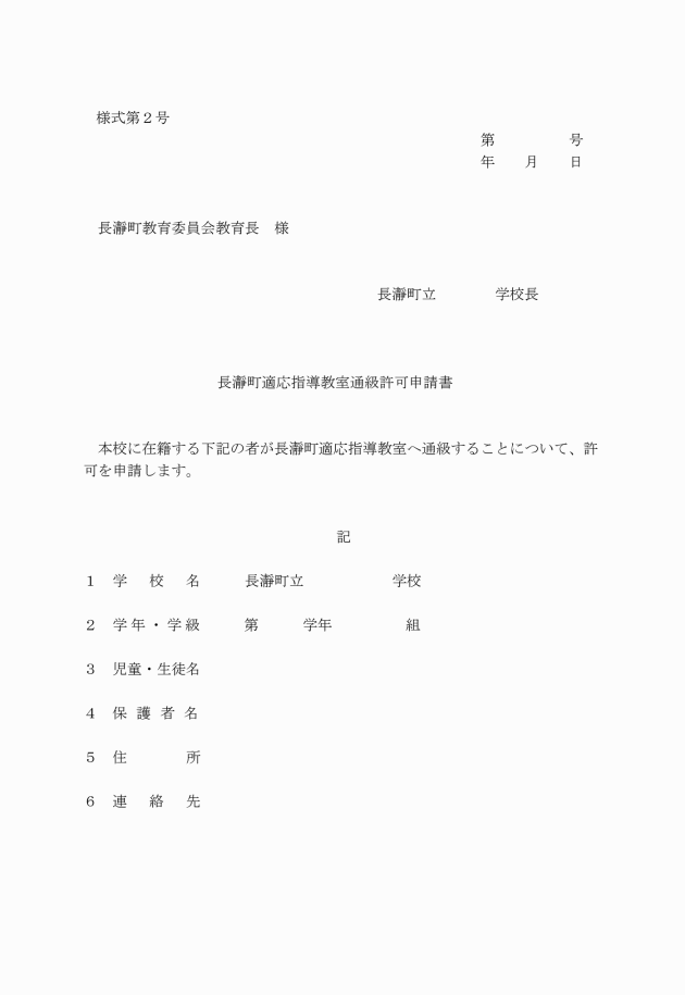 第7条 入室を希望する児童・生徒の保護者は、本人の意思を確認した上で、長瀞町適応指導教室通級申請書(様式第1号)を在籍校の校長に提出するものとする。