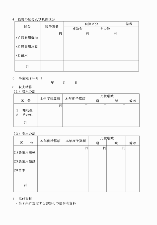第7条 交付決定者は、補助対象事業を完了し、又は廃止したときは、補助対象事業の完了後30日又は当該会計年度の3月20日のいずれか早い日までに、長瀞町未利用農地の利活用促進事業費補助金実績報告書(様式第5号。以下「実績報告書」という。)を県要綱別表2に掲げる書類を添えて町長に提出しなければならない。