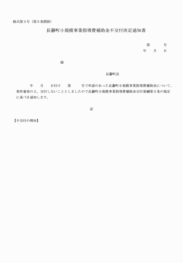 第4条 補助金の交付を受けようとする補助事業者の代表者は、長瀞町小規模事業指導費補助金交付申請書(様式第1号)に関係書類を添えて町長に提出しなければならない。
