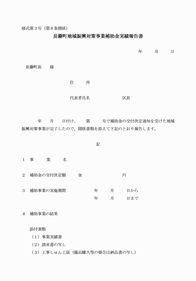 第8条 補助事業者は、補助事業完了後速やかに長瀞町地域振興対策事業補助金実績報告書(様式第3号)を町長に提出しなければならない。
