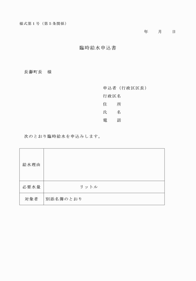 第5条 対象者が臨時給水を受ける場合は、区長を通じて臨時給水申込書(様式第1号)を町長に提出しなければならない。