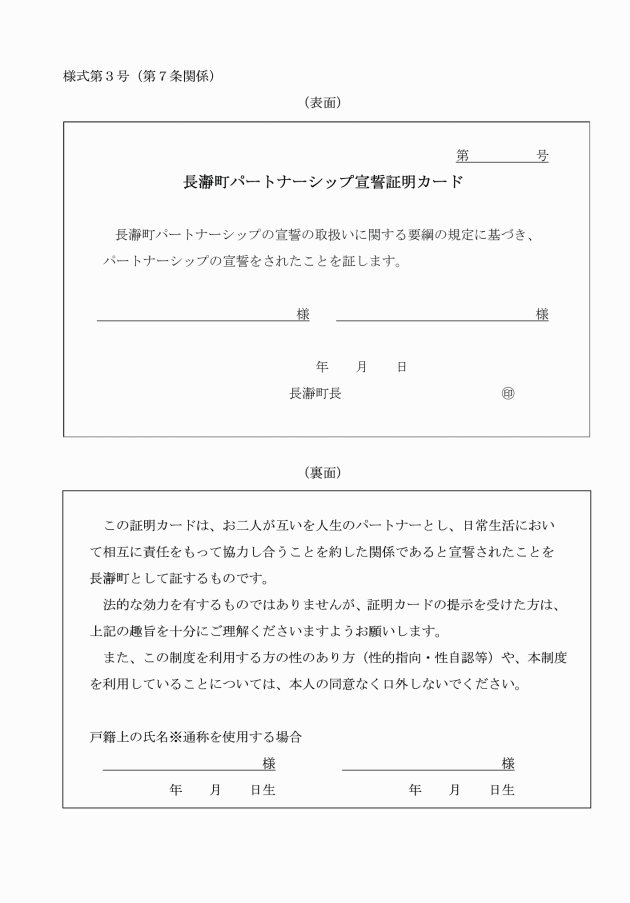 第15条 この要綱に定めるもののほか、パートナーシップの宣誓に関し必要な事項は、町長が別に定める。