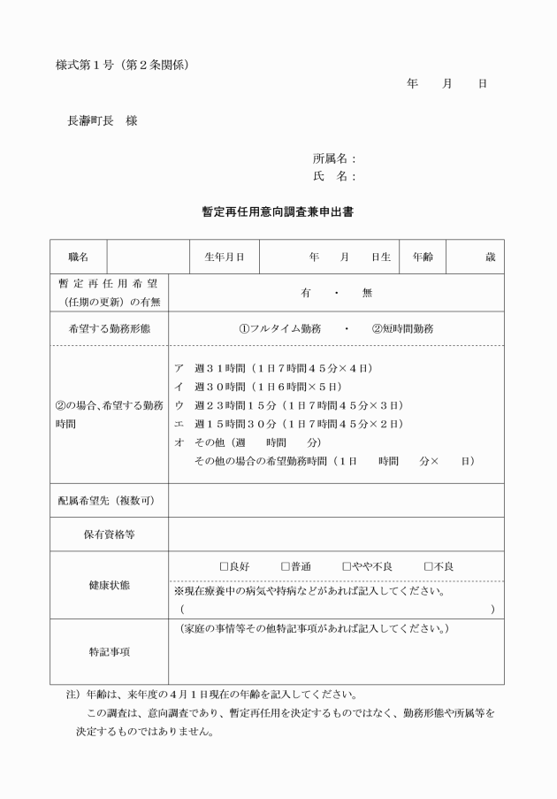 第2条 町長は、暫定再任用の対象となる職員に、暫定再任用意向調査兼申出書(様式第1号)により、その意向の調査を行うものとする。